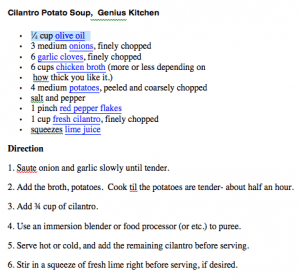 Bypassing Carrot Chili and Cilantro soup and Lime Cilantro soup, I finally landed on Cilantro Potato Soup. (Click recipe to make it larger. Click the back arrow in the menu at the top to return to the post.)