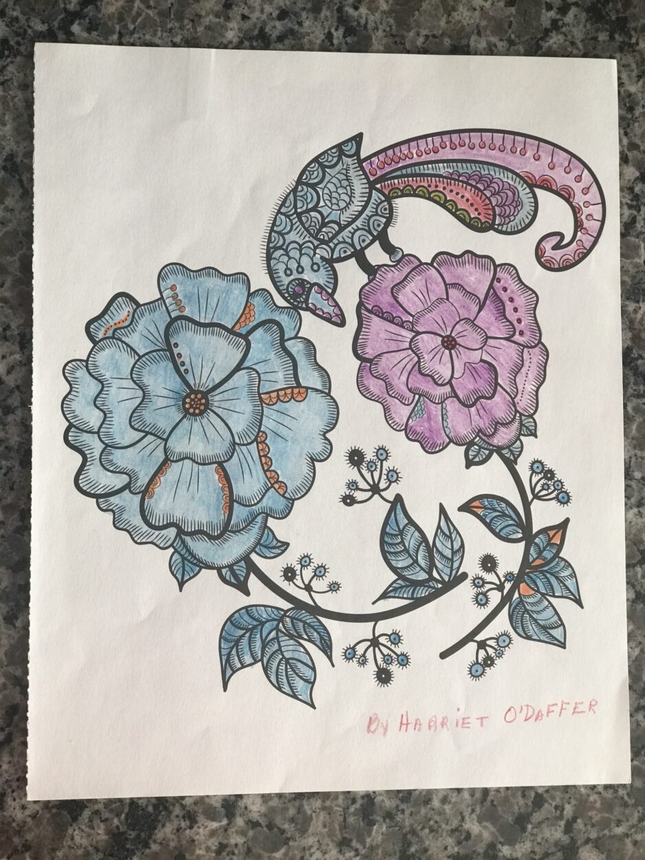 Harriet loved coloring, golf, driving the car, bridge, choir, crossword puzzles, reading, listening to music, poems, and watching sports. My goal was to keep her doing these things as long as she could do them. The following picture she colored halfway through her Alzheimer’s journey illustrates this.
