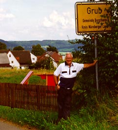 Excited to see the real homes of our ancestors, we took a required detour through the fields in a beautifully wooded and hilly countryside and soon came upon the very small village of Grub. I felt at home here, as I “held up the sign post” outside the city of my ancestors.