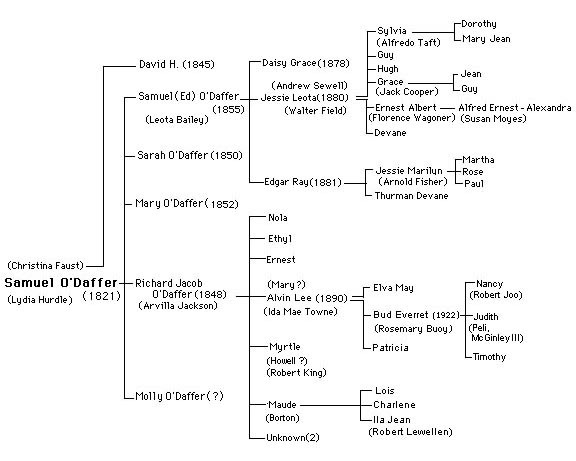 Samuel was born in 1821 in Washington County, Maryland, near Clear Spring. He married Christena Foust, sister of his brother John’s first wife, in January, 1844 in Pickaway County, Ohio. He married Lydia Ann Hurdle in April, 1847, in Pickaway County, Ohio. Not long after that, they moved to Indiana, near Kewanna, where Samuel died in February, 1886. Samuel started what I call The Indiana Branch of the Odaffer family. As a result of this website, I was fortunate to become acquainted with Al Field, who is a descendant of Samuel O’Daffer, is shown in the chart below, and who provided extensive, well documented, information about this branch. An abbreviated chart of Samuel’s descendants is shown below.