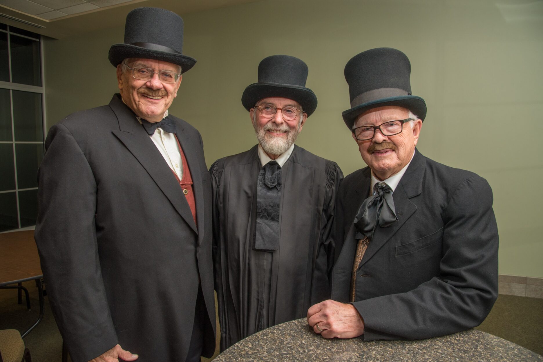 Relying on Judy Brown’s well-stocked basement wardrobe, we acquired a hat, vest, and waistcoat from the 1890 era for Wadley and Pervis. Judge Fairshake wore a hat and one of his judicial robes.